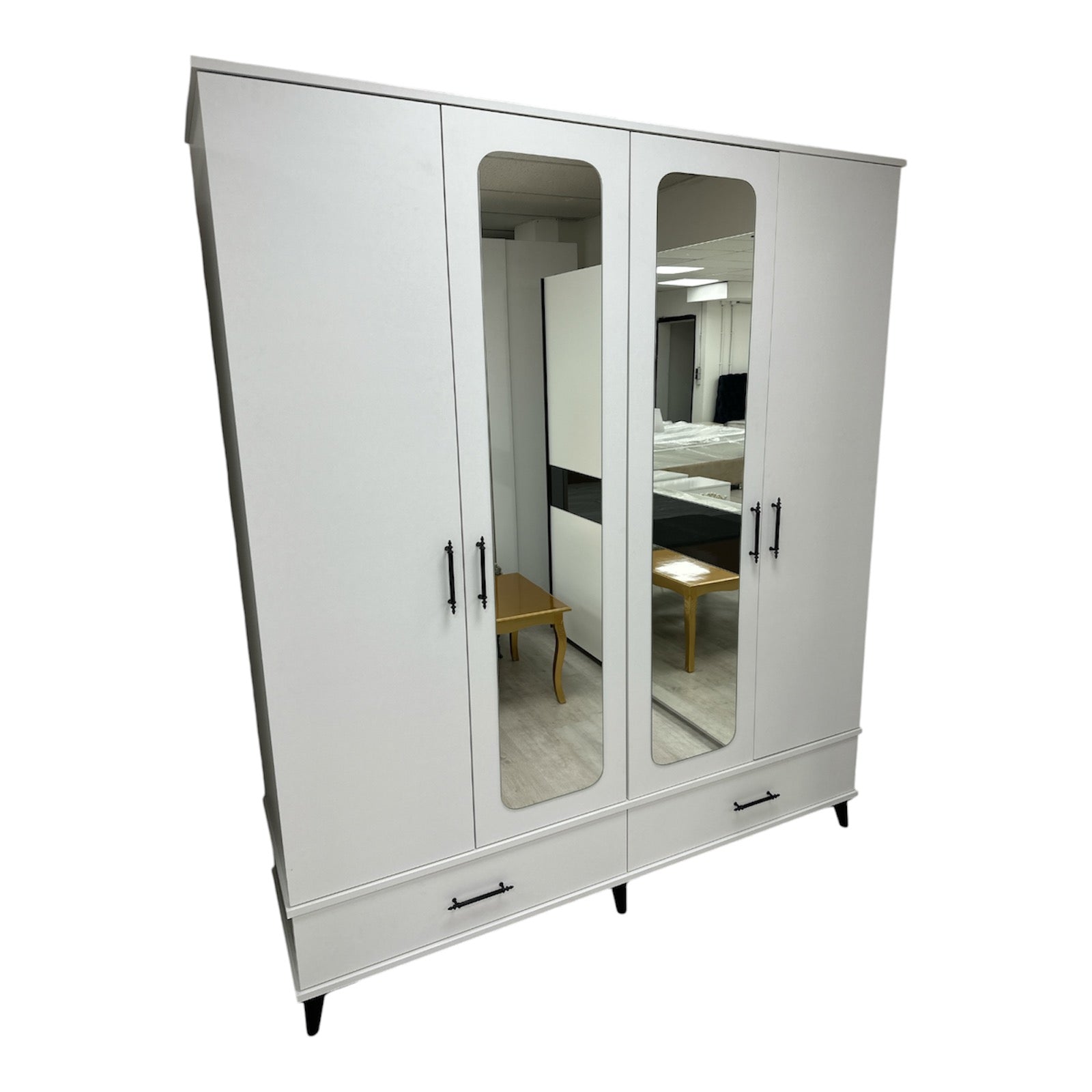 Der Kleiderschrank "Arya" bietet mit 180 cm Breite und vielen Fächern und zwei großen Schubladen viel Stauraum. Seine Füße sorgen für eine stabile Konstruktion. Eine praktische Wahl für eine organisierte Garderobe.