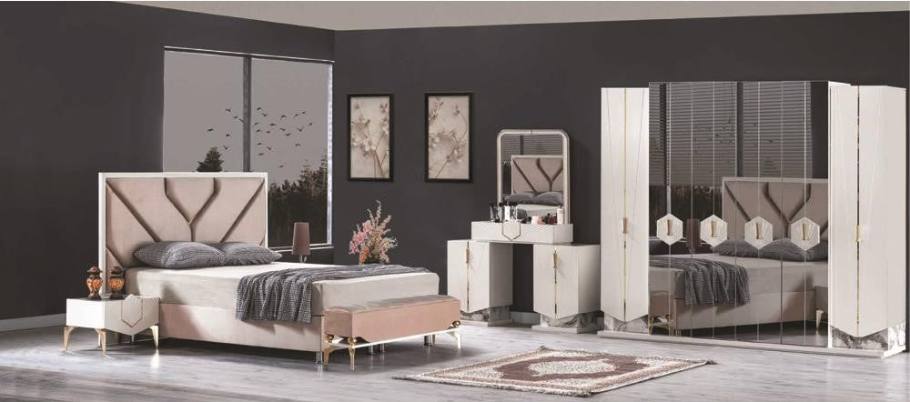 Dieses Komplette Schlafzimmer "Asaf" wird Ihnen luxuriöse und qualitativ hochwertige Elemente bieten. Das Bett bietet eine praktische Kastenfunktion für zusätzlichen Stauraum. Das Set beinhaltet neben dem Bett auch zwei Nachttische, einen Schminktisch, einen Kleiderschrank und eine Sitzbank. Genießen Sie entspannte Nächte in diesem eleganten und funktionalen Schlafzimmer.