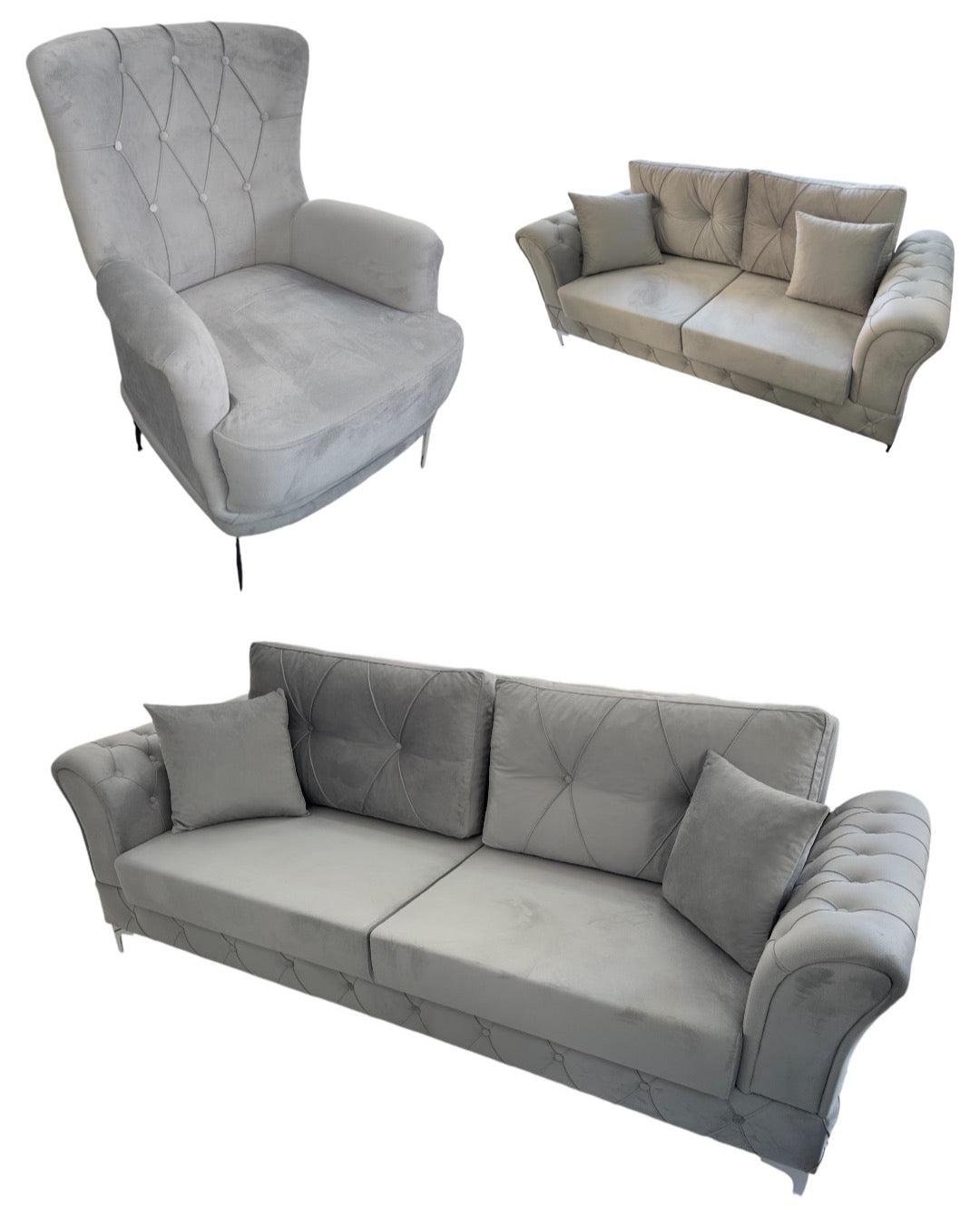 Erleben Sie höchsten Komfort und Stil mit dem Sofa "Alina". Mit seiner robusten Schlaffunktion, großem Stauraum und stabilen Metallfüßen verwandelt es Ihr Wohnzimmer in einen gemütlichen Rückzugsort. In der eleganten hellgrauen Farbe und 3+2+1 Kombination wird es zum Highlight Ihrer Einrichtung.