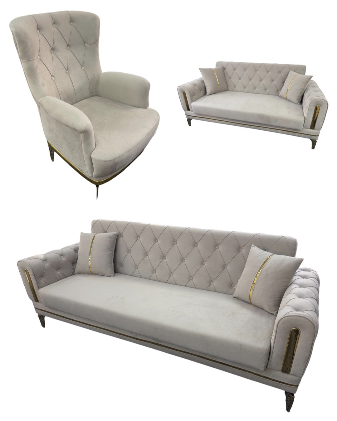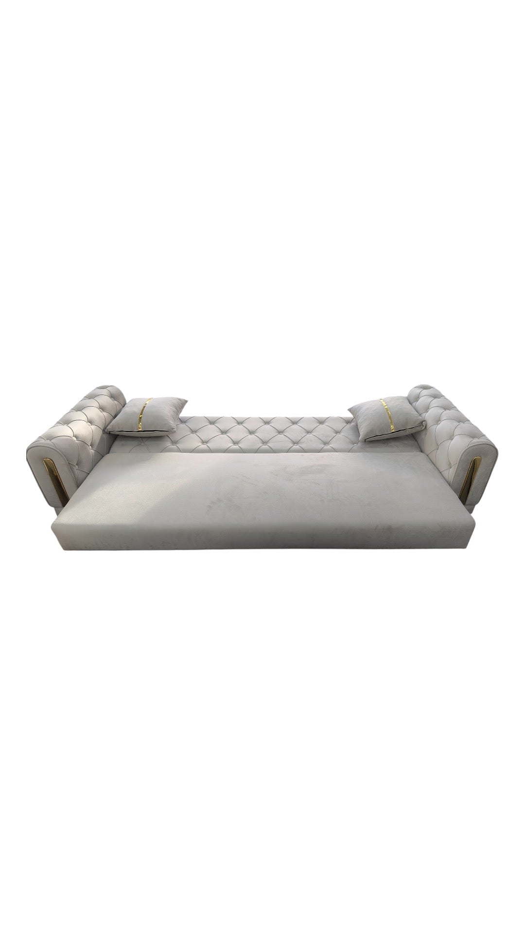 Die "Roza" Sofa ist ein elegantes und stilvolles Möbelstück, das Ihnen nicht nur eine komfortable Sitzgelegenheit bietet, sondern auch praktische Funktionen wie eine Schlafmöglichkeit und Stauraum. Mit einer 3-2-1 Kombination und schönen goldenen Details ist sie eine hervorragende Wahl für Ihr Wohnzimmer. Die hohe Qualität und Stabilität machen sie zu einem langlebigen und zuverlässigen Begleiter in Ihrem Zuhause.